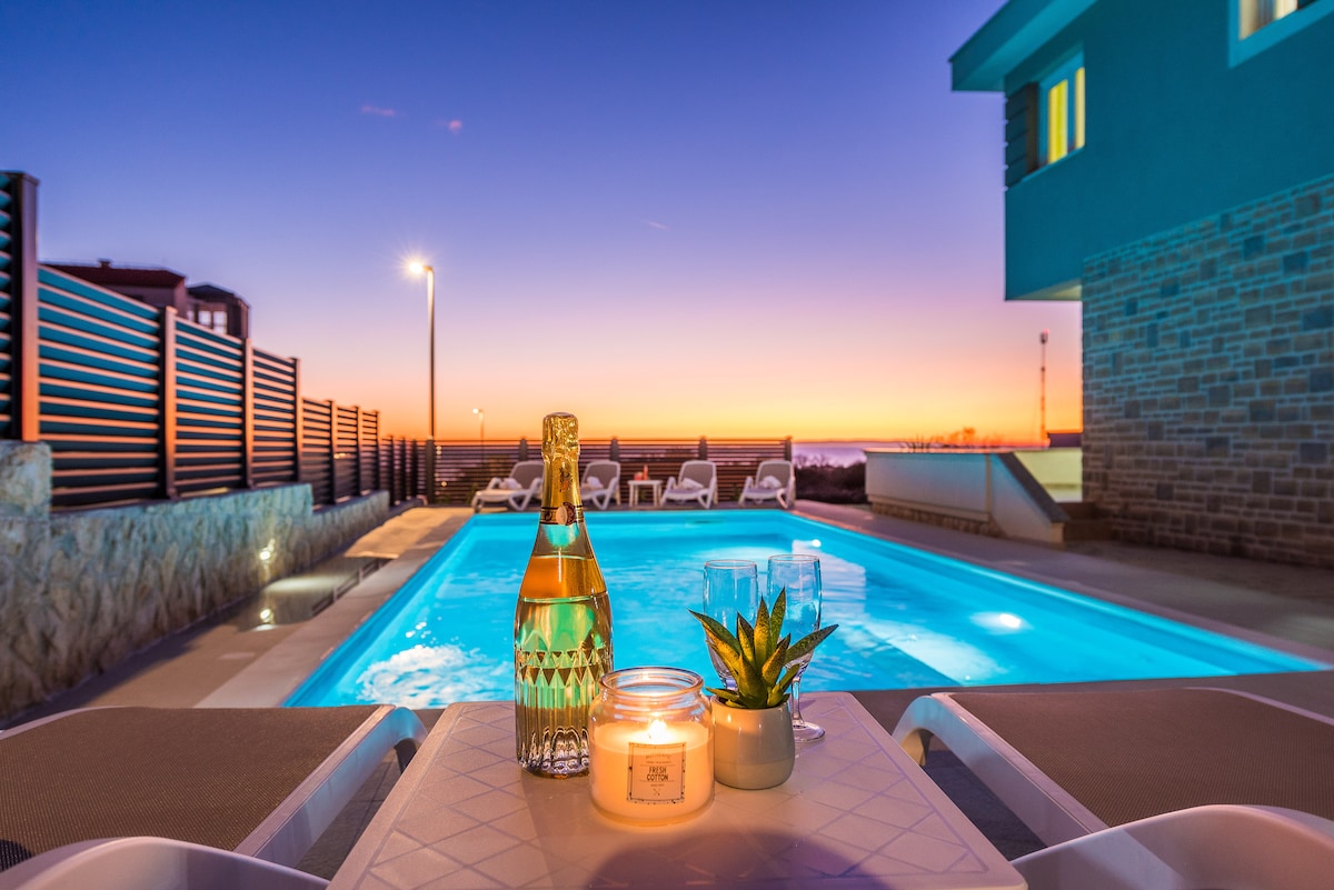 Moderna luksuzna vila sa bazenom i pogledom na more. Vila ima 5 moderno opremljenih stanova za 6 osoba sa prostranom terasom i prelepim pogledom na more. Apartman ima besplatan Wi-Fi, klima-uređaj i parking mesto. U bašti je lep bazen (koji se deli sa drugim gostima ) gde gosti mogu da se opuste tokom dana. Vila se nalazi na samo nekoliko minuta hoda od plaže i nedaleko od centra grada. Bakalnica i autobuska stanica sa direktnim linijama do plaže Zrće nalaze se pored vile.