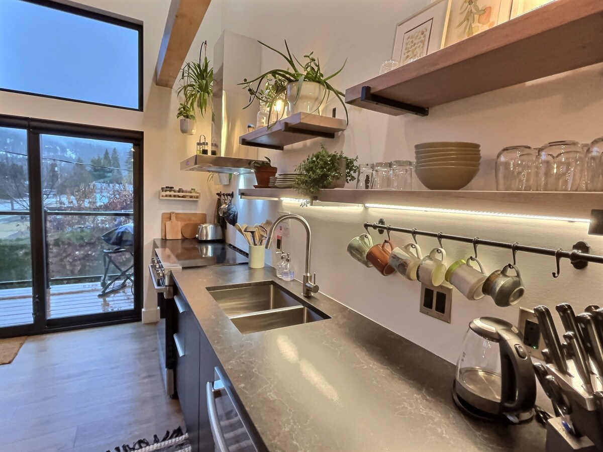 Welcome to this modern, spacious suite with beautiful views from every window of Golden's spectacular mountain ranges and legendary Kicking Horse Mountain Resort. The deck overlooks a quiet park and town centre is just a short walk, via a unique timber frame pedestrian bridge, as are scenic biking and walking trails. Brew a beverage at the coffee bar and curl up and relax next to the large, stone, gas fireplace after a day of skiing or adventure. Come stay with us and experience Golden.