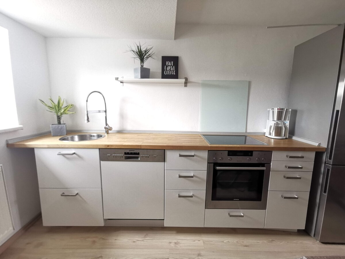 veliki stan u istorijskom Vierseithofu. Prizemlje, 4 spavaće sobe, 2 kupatila i veliki dnevni boravak/trpezarija sa kuhinjom. Ispred ulaznih vrata je prostor za sjedenje sa travnjakom, a iza njega je grmlje i igralište. Željeznička stanica je udaljena samo 1,3 km, odatle je 25 minuta do Evropske prestonice kulture Chemnitz, 55 minuta do Drezdena i 1,5 sat do Lajpciga. Do Frajberga pored Centralnog saksonskog pozorišta možete doći za 7 minuta.