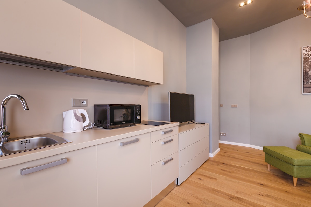 Naš apartman je idealan za 2 osobe, a pogodan je i za 4 osobe. Potpuno je opremljen. U frižideru vas još uvek čeka nešto :-) U spavaćoj sobi se nalazi jedan bračni krevet, a u kuhinji još jedan bračni krevet (kauč na razvlačenje). Nalazi se na 3. spratu u veoma lijepoj kući u stilu art nouveau.