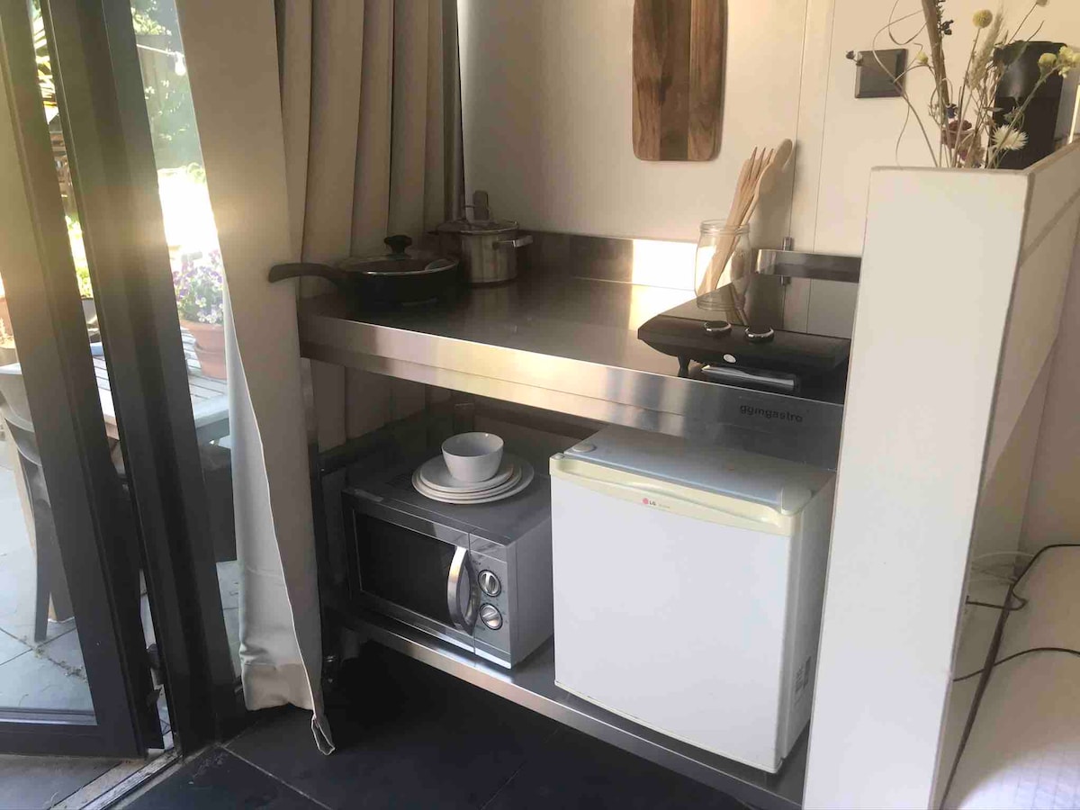Luksuzni studio, koji je dizajnirao poznati dizajner, nalazi se u prizemlju naše karakteristične kuće iz 1930-ih, samo 100 metara od plaže. Otvoreno potkrovlje odiše prostorom i udobnošću, sa samostojećom kadom, tuš-kabinom i podnim grijanjem. Umjetnost koja se mijenja čini svaki boravak jedinstvenim. Potpuno opremljena kuhinja je san za ljubitelje kuvanja. Uživajte u intimnoj bašti, mirnoj oazi koja se besprekorno povezuje iznutra i spolja.