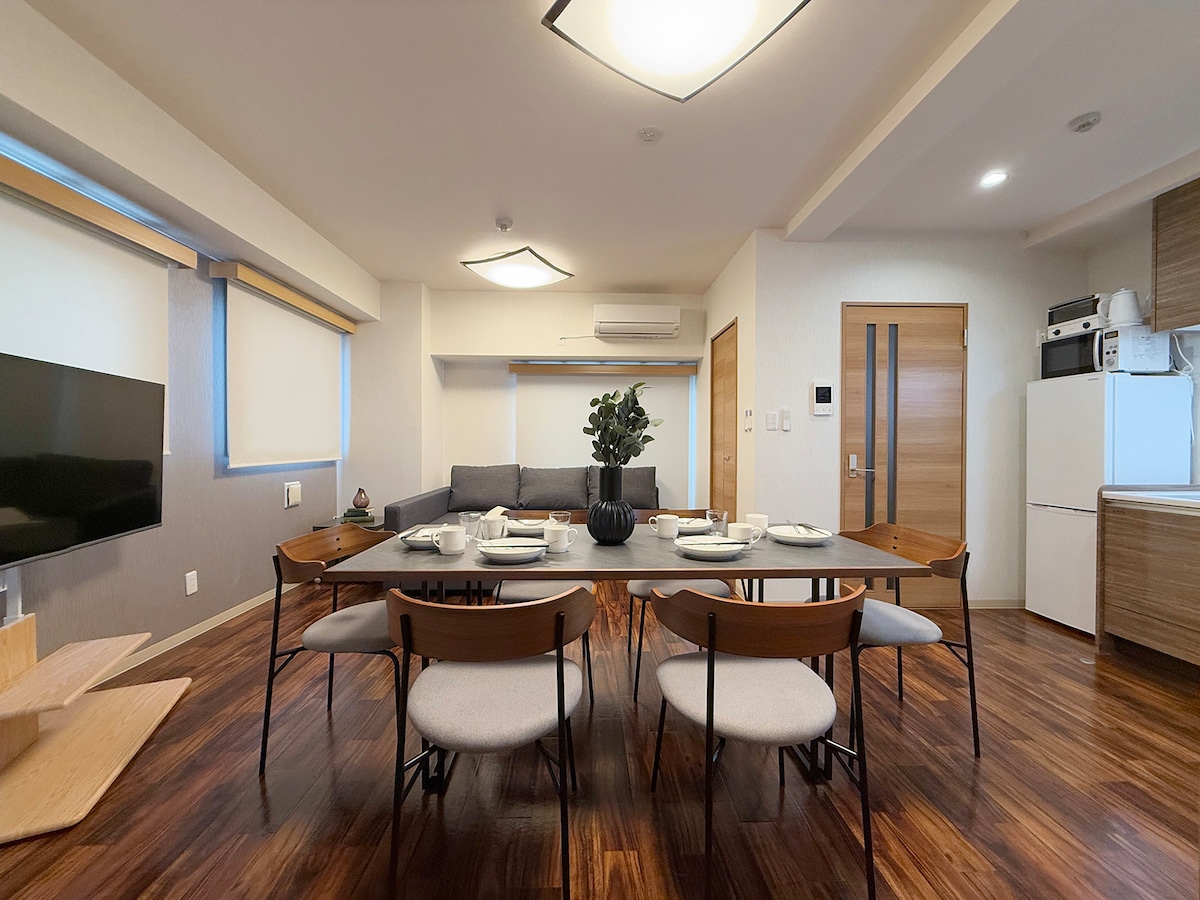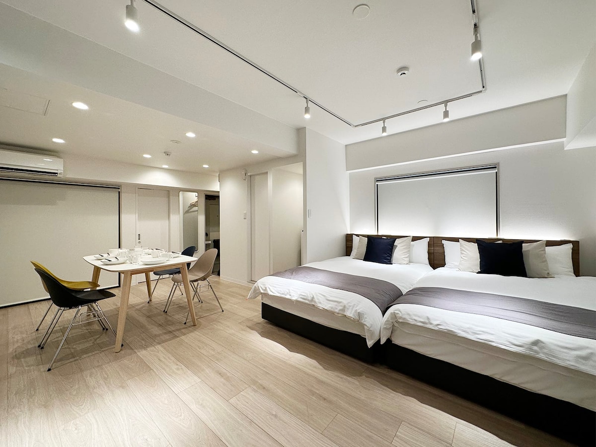 Located just a 10-min walk from Hiroshima Station, this spacious unit is ideal for families or groups, comfortably accommodating up to 4 guests with 2 double beds. Situated on the 3rd floor, the unit offers full privacy with no shared spaces. Please note, the building does not have an elevator. Amenities include a washing machiner, perfect for longer stays. Fresh towels are provided, with professional cleaning ensuring a tidy, welcoming space.