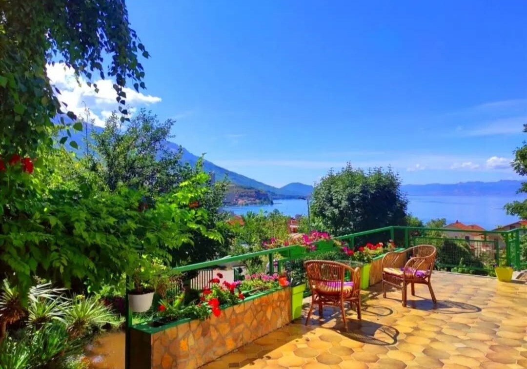 Smješten na najvišoj tački Pestanija (Ohrid), vaš apartman (drugi sprat) nudi jedinstven pogled na Ohridsko jezero i planinu Galičica. Okruženi zelenilom i obiljem prirode, možete uživati na jednoj od 5 terasa s pogledom na jezero ili planinu, ili jednostavno sjediti u bašti pored fontane i slušati zvuk reke. U svom apartmanu de luxe nalaze se 2 spavaće sobe, 1 dnevna soba, kuhinja sa kompletnom opremom, kupatilo, WC šolja, zatvorena terasa sa vatrom i ogromna zelena bašta.