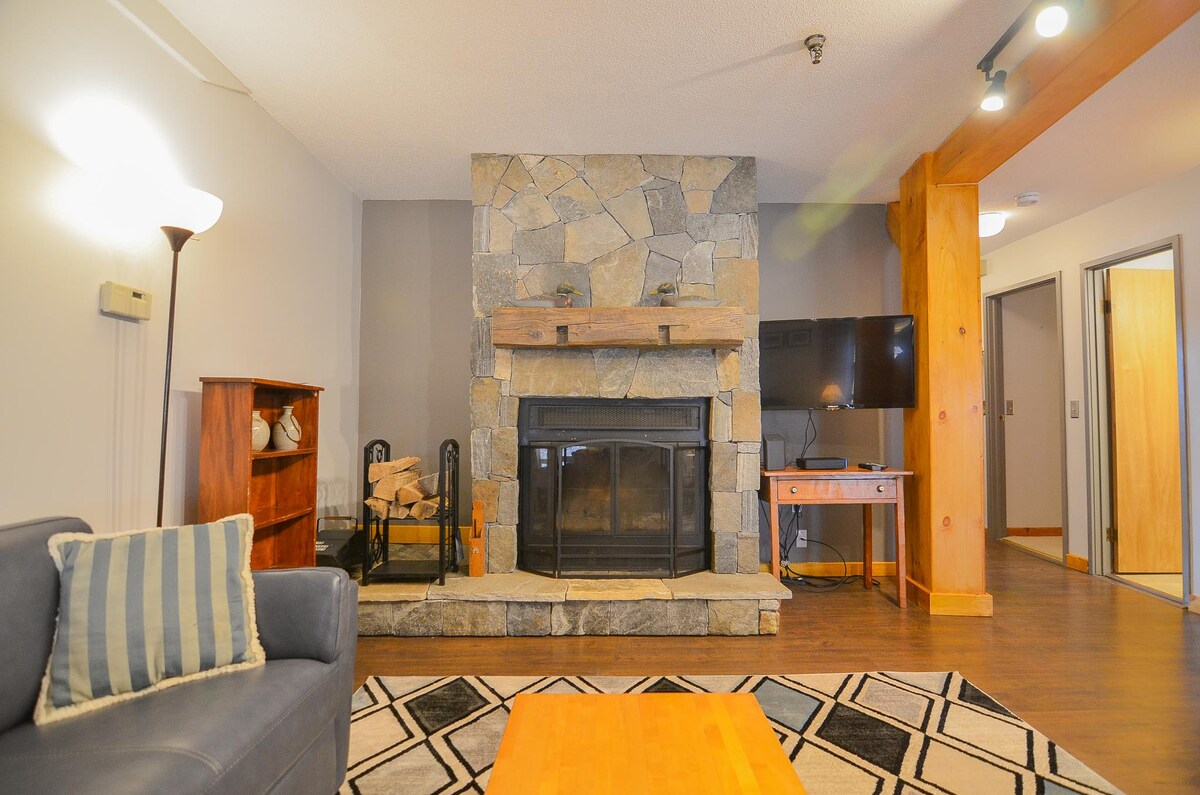 Moderan i udoban kondominijum za skijanje, za 6 osoba. Kratka šetnja, 250 koraka do staze Sahem. Skijajte pravo do Sunbursta 6 i drugih liftova i izbjegavajte redove i probleme sa parkiranjem u podnožju. Pet minuta vožnje do glavne kolibe i škole skijanja. Odličan dekor, potpuno namješten. Dnevni boravak, novi kamin, glavna spavaća soba, kupatilo sa tušem, mašina za pranje i sušenje veša. Potkrovlje sa bračnim krevetom i 2 kreveta za jednu osobu na spratu. Wi-Fi, kablovska, pribor za kuvanje, peškiri i posteljina. Drva za ogrev su uključena. Zajednički prostor za skijanje i snoubord ispred vrata.