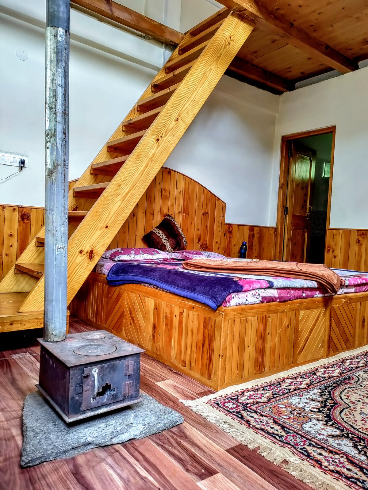 To je privatna kuća sa drvenim enterijerom. Smještaj ima udoban tavan i lični tandoor koji će vas grejati. Kupatilo i kuhinja su prisutni u prilogu. Potpuno je namješten, a kuhinja je opremljena plinskim šporetom, potrebnim priborom i priborom za jelo. Na prednjoj strani je privatni balkon, a pozadi su samo planine. Naš dom je opremljen toplom vodom veličine 24x7 i neograničenim brzim Wi-Fi mrežom kako se naši gosti ne bi suočili sa problemima sa mrežom i osećali se kao kod kuće.