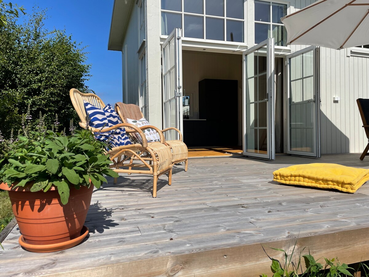 (NAPOMENA v26-29 se iznajmljuje nedeljno od nedelje do nedelje uz obavezno dodavanje čišćenja uz naknadu od 1000 SEK, ali uz popust od 10% kao nedeljni popust na ukupnu kiriju). Novoizgrađeni apartman za goste koji je dizajnirao arhitekta u pozadini mirnog područja sa nevjerovatnim okruženjem. Kratka šetnja do plaže i biciklistička udaljenost do centra Varberga. DOBRO DOŠLI U NAŠ DOM🌸