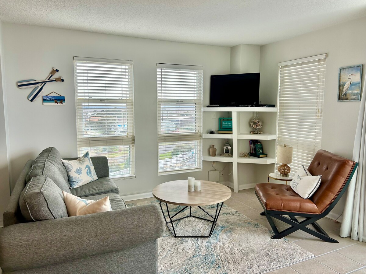 Doživite luksuz na obali okeana po porodičnoj cijeni! Naš stan na najvišem spratu nudi pogled koji oduzima dah na blistavi Atlantski okean, zaliv Čedvik i okolna močvarna područja. U prostranom rasporedu 1 kreveta/2 kupatila sa krevetima u hodniku i kaučem za spavanje u dnevnom boravku udobno može da spava do četiri odrasle osobe i dvoje djece. Svi gosti imaju pristup odmaralištu St. Regis, koje je jedinstveno za Topsail Island. Imajte na umu da se u zgradi pored nas izvode građevinski radovi tokom jeseni/zime 2025.