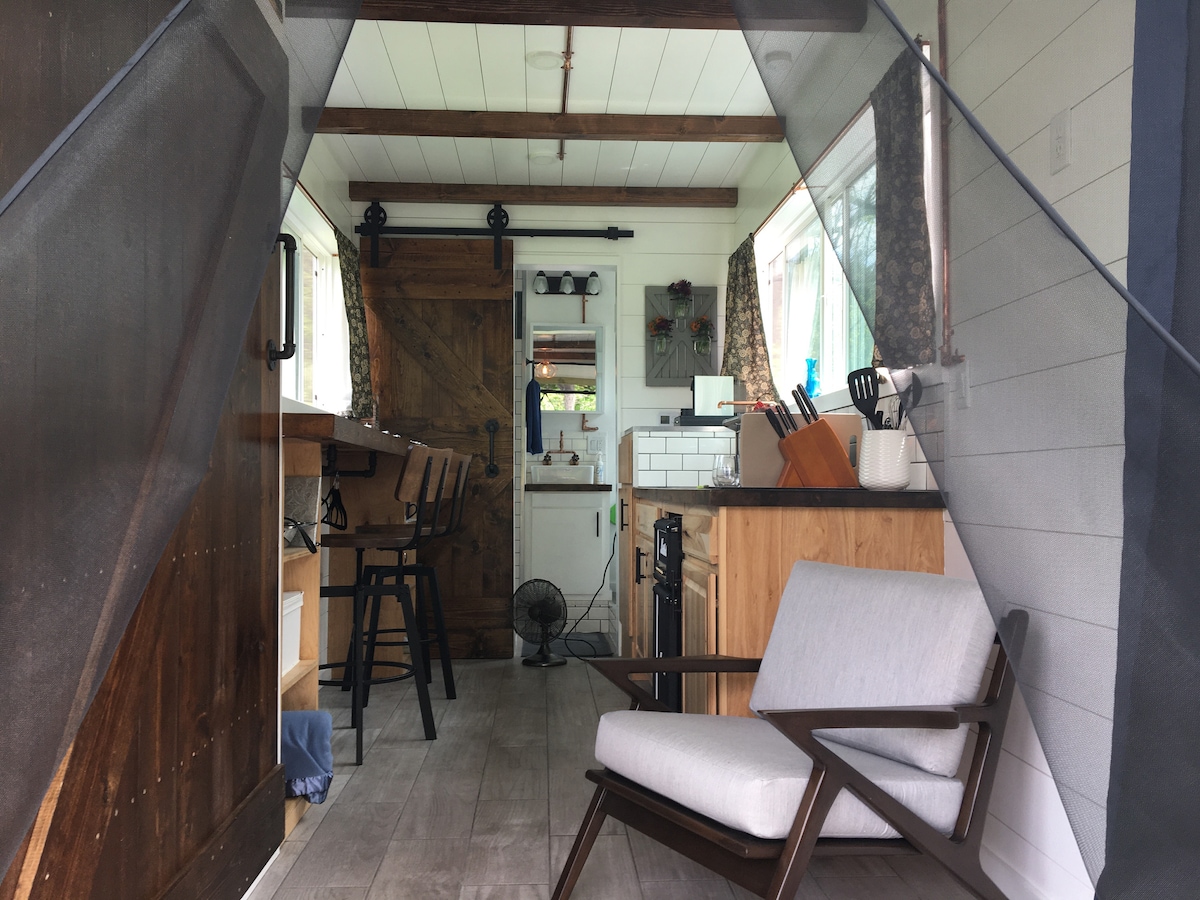 Malo mira i sadržaja u ovoj rustičnoj, dobro uređenoj maloj kući na točkovima. VREME JE ZA ODMOR! Savršeno za par. Predivan pogled na jezero Keuka. Potpuno opremljena kuhinja, terasa sa baštenskim nameštajem i roštiljem na propan. Ognjište sa stolicama Adirondack. Uživajte u simfoniji noći pod zvezdama sa s'moresima. Odlična lokacija do vinarija, pivara i restorana. 3 minuta do državnog parka Keuka Lejk. Skoro sve što imamo je napravljeno u SAD.