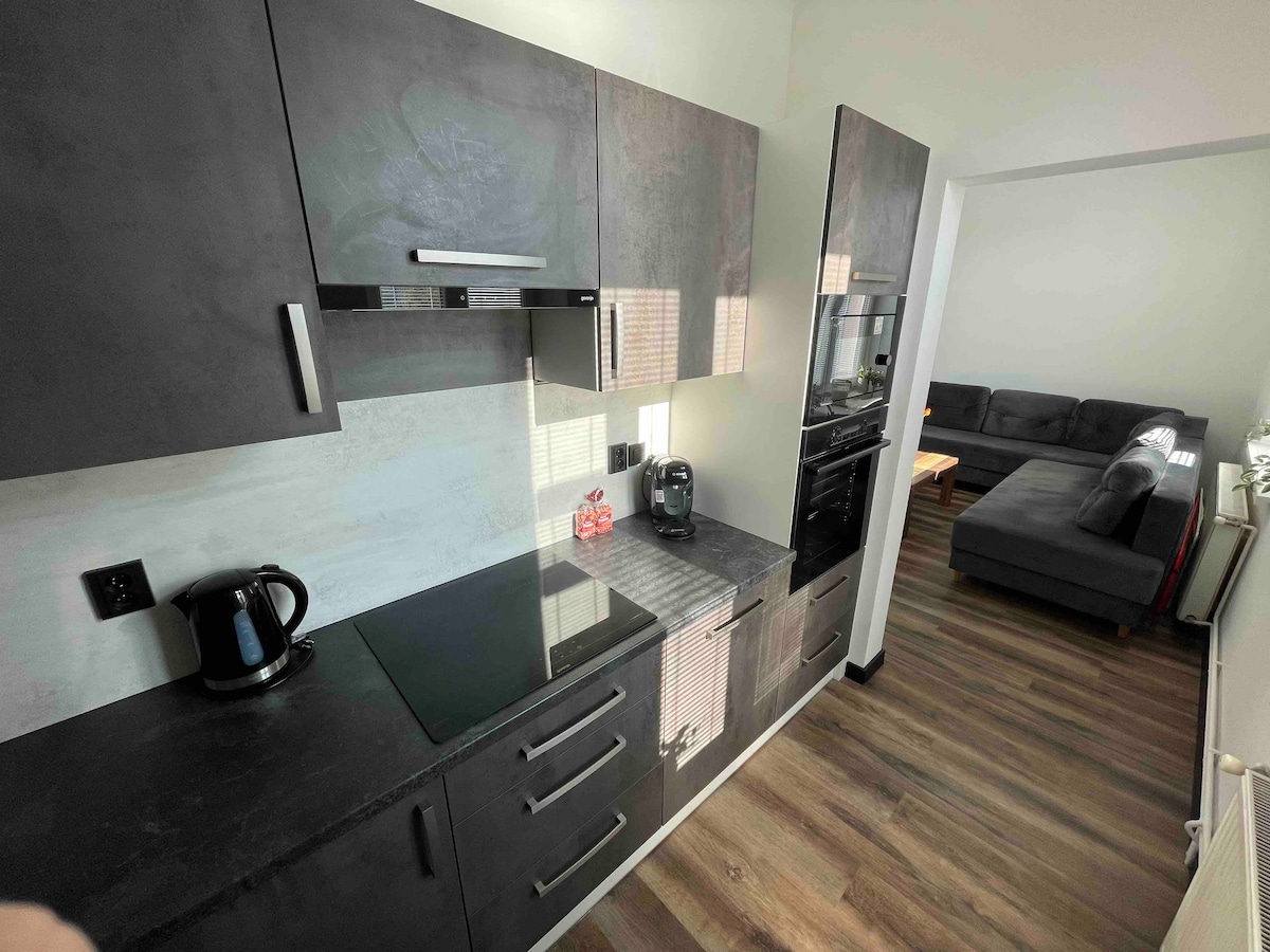 Moderno uređen stan u centru grada, dostupan za 3 osobe + čajna kuhinja. Dve odvojene, nepovezane spavaće sobe sa bračnim krevetima (širine 150–179 cm), kuhinja, dnevna soba sa trpezarijom, kupatilo. U dnevnoj sobi se nalazi sofa na razvlačenje (širine 140 cm / 55 inča) za petog i šestog gosta. Stan se nalazi u blizini centra grada, tržnog centra Nová Karolína i četvrti Dolní Vítkovice.