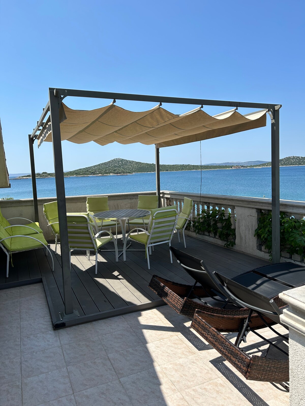 100m von Hafen und Meer entfernt befindet sich die Unterkunft mitten in der dalmatinischen Kleinstadt Tkon. Die Unterkunft ist voll möbliert und bietet vollen Komfort - fühlen Sie sich wie zu Hause! Sie verfügen über eine 25qm große Terrasse mit 180 Grad Meerblick und Außenküche. Mit dem Fahrrad oder zu Fuß gelangen sie in wenigen Minuten zu den ersten Stränden.