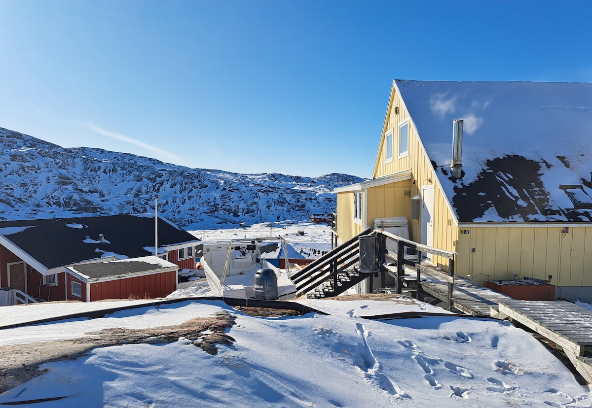 Opustite se u ovom jedinstvenom i mirnom prostoru. Spreman je za iznajmljivanje sa novom bojom, toplotnom pumpom, klikom na pod, malom kuhinjom i raznim namještajem. Slobodno pitajte putem imejla. Nema vode, tj. nema kupatila wC šolja je suva WC šolja. Prilikom iznajmljivanja, ima 20 litara čiste vode, a ako želite više, slavina za vodu je udaljena 150 metara od kuće. To nije luksuzna kuća, već za vas koji želite da pokušate da odsjednete u nešto starijoj, autentičnoj grenlandskoj kući.