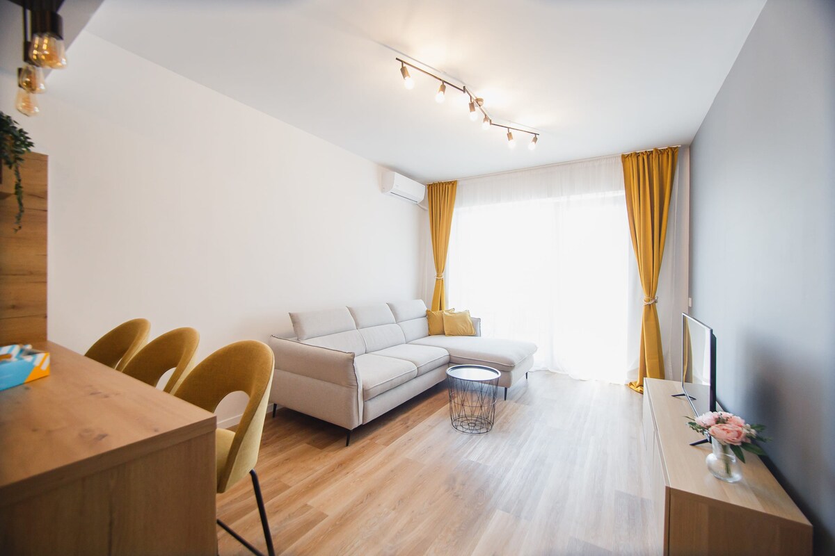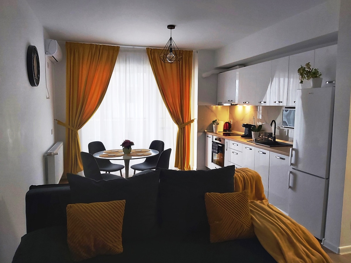Two-room apartment, in a new residential complex Prima Premium Decebal Oradea. Located in a quiet area with video surveillance near the Prima Shop Shopping Center, with grocery stores, terraces, fast food, fitness room, beauty salon, cafe and park with children's playground. Parking space with video surveillance. The apartment is just 2 km from the city center, Oradea Fortress is 2.5 km away, and the Nymphaea Aquapark is 3 km away. Easy access to the airport.