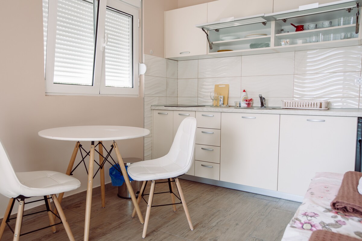 Slatki stan u malom selu 8 km od Kotora i 5 km od Perasta biće odlično mesto da se zaustavite ako želite da putujete, ali i da uživate u plaži koja je udaljena 3 minuta hoda od zgrade. Jednostavno opremljen, ali sa svime što vam treba za kraći ili duži boravak. Možete da napravite uspomene u ovom jedinstvenom i porodičnom smeštaju sa pogledom na more i daleko od letnje gužve u centru grada.