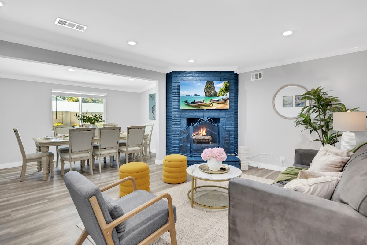 Art-filled retreat with unique artifacts, a lush garden with vibrant plants and vegetation, small pond, private pool & spa, firepit, and outdoor kitchen. Relax in a quiet cul-de-sac with two shaded patios, modern entertainment including streaming TVs, surround sound, a small pool table, and an Xbox. Ideal for families, friends, couples, or business travelers seeking comfort, privacy, and a memorable Southern California stay near Disneyland and major attractions.