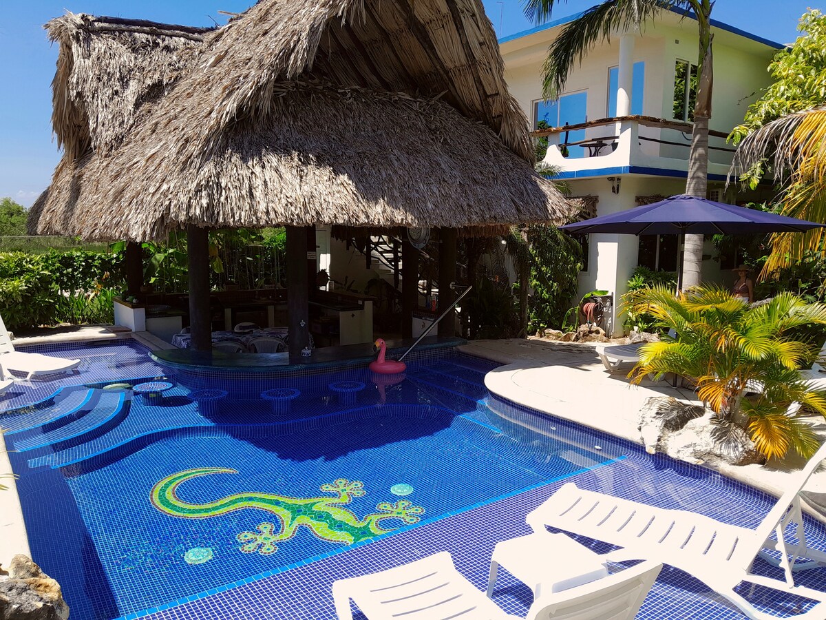 GOLD STANDARD RATED! Custom 1BR Loft Bungalow ideal located for all your for your Fun Mainland Excursions! BESPLATAN PREVOZ OD/DO AERODROMA Može udobno da spava 4 osobe sa bračnim krevetom (širine 150-179 cm) u sopstvenoj spavaćoj sobi i 1 bračnim krevetom Marfi u prednjem dnevnom boravku. Klima-uređaj, čajna kuhinja, kafa, frižider, ploča za kuvanje i mikrotalasna pećnica Odličan prilagođeni bazen, unutrašnje dvorište, roštilj, palapas Iako primamo porodice sa starijim tinejdžerima, primjenjuje se minimalna starost od 10 ili višegodina za djecu Nudimo terensko vozilo za iznajmljivanje isključivo našim gostima po cijeni od 75 USD dnevno