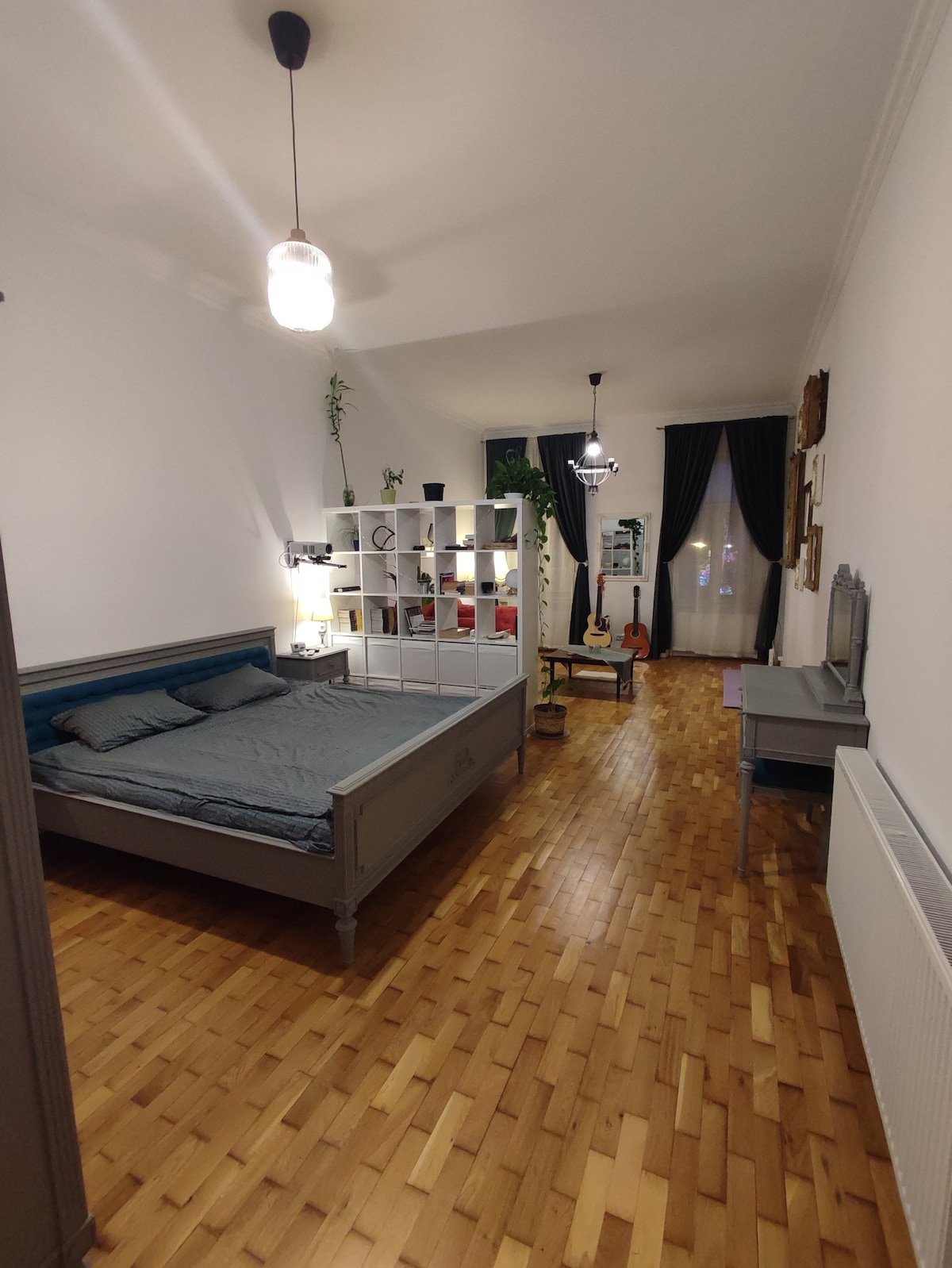 A central cosy apartment in a historical building fully renovated with a view at the city center close to everything. You will find everything you need in the apartment with a massive king size bed and music instruments. The bars are under the apartment so at night you can hear the music.