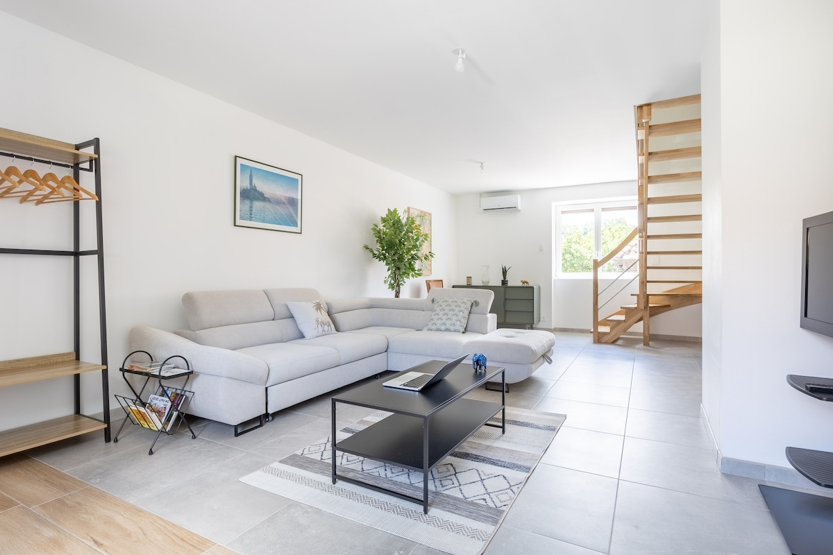 Mirni dvoetažni stan, u srcu vulkana, na visinama Clermont-Ferrand, u podnožju Puy de Dôme (UNESCO). U prizemlju: dnevna soba + kuhinja; na spratu: spavaća soba + kupatilo-WC. 4 kreveta: kauč na razvlačenje (clic-clac) u dnevnoj sobi + veliki dble krevet koji se može pretvoriti u 2 kreveta za jednu osobu. Odlazak pješke od smještaja, Vulkanija udaljena 11 minuta, srce Clermont-Ferrand 14 minuta, Royatonic 11 min. Za ljubitelje prirode: masiv Sansi udaljen 45 minuta, jezero sa plivanjem je dozvoljeno 24 minute. Smještaj u blizini sadržaja.