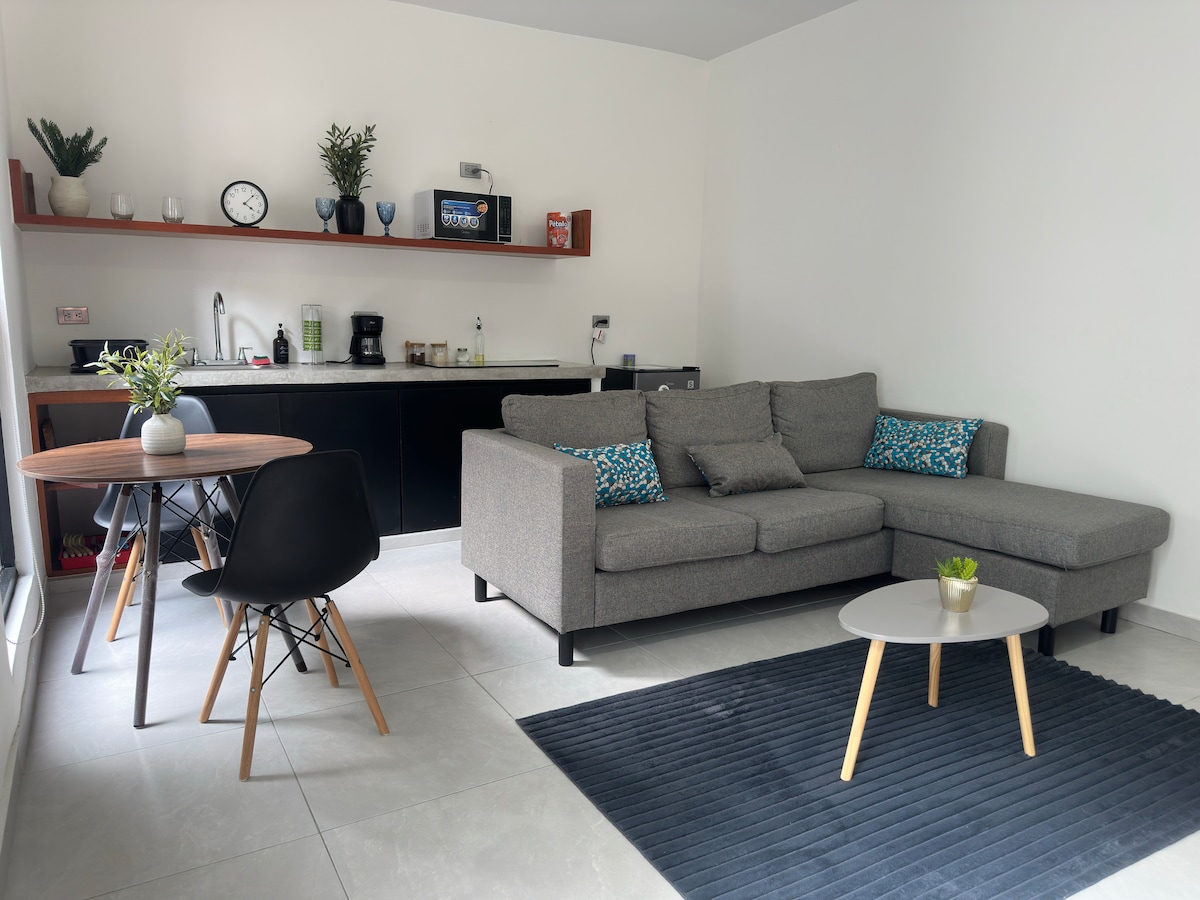 Hospédate en un departamento estiloso y funcional recién construido que ofrece diseño contemporáneo, confort y ubicación privilegiada. A solo minutos del Cerro del Borrego Ecoparque y del Parque Alameda, este espacio en planta baja con patio compartido es perfecto para disfrutar de Orizaba entre naturaleza y cultura. A pocos metros tienes acceso a una parada de autobuses, entre ellos el “Gallo”, que recorre la ciudad gratis y conecta con sus principales atractivos turísticos.
