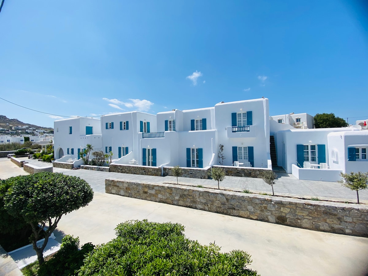 Welcome to our charming studio complex in Mykonos, located near the beautiful Ornos Beach.Our comfortable studios accommodate 2 to 4 guests and are ideal for couples, families or small groups of friends.Each studio features a private bathroom, a small kitchenette with cooking utensils, and a private balcony or terrace with table and chairs the perfect spot to relax and enjoy peaceful evenings after a wonderful day at the beach.A comfortable and welcoming base for exploring the beauty of Mykonos.