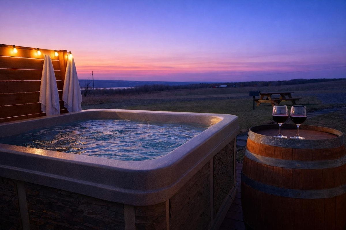Fox Den je potpuno opremljen studio apartman od 600 kvadratnih stopa sa svim pogodnostima koje su vam potrebne. Jedite vani ili kuvajte u našoj čajnoj kuhinji. Pogled sa vaše terase na drugom spratu je zapanjujući sa zalascima sunca iz snova. Potkrovlje ima visoke, otvorene plafone koji vam daju osjećaj kolibe koja odmah donosi opuštajuću atmosferu. Pješačite našim stazama na 4 hektara pored našeg glamping terena, uključujući ribnjak za ribolov Vaše osamljeno mjesto je tačno na sredini vinogradarske zemlje i staza državne šume