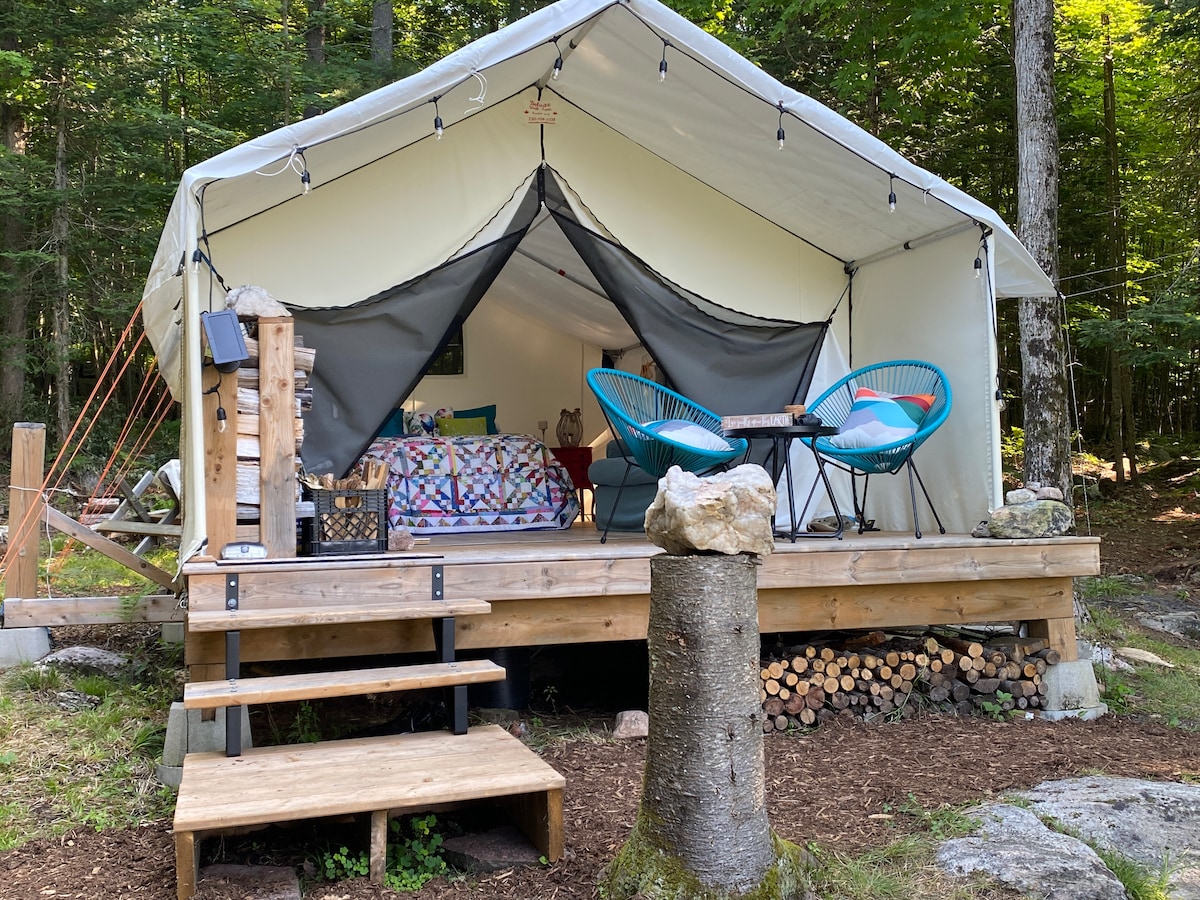 *Na Hipcamp-u smo proglašeni drugom osobom za najbolje glampovanje u Kanadi za 2023. godinu!* Savršena baza za sve obližnje šetnje, jezera i avanture na otvorenom. Pobjegnite od svega kada ostanete pod zvijezdama. Ušuškajte se u udobnom bračnom krevetu. Plovite niz potok. Opustite se u visećoj ležaljci uz dobru knjigu. Šator od 16,5 stopa nalazi se pored potoka koji protiče kroz živopisno imanje. Lokacija je opremljena bračnim krevetom, prostorom za sjedenje, ognjištem i stolicama Muskoka.