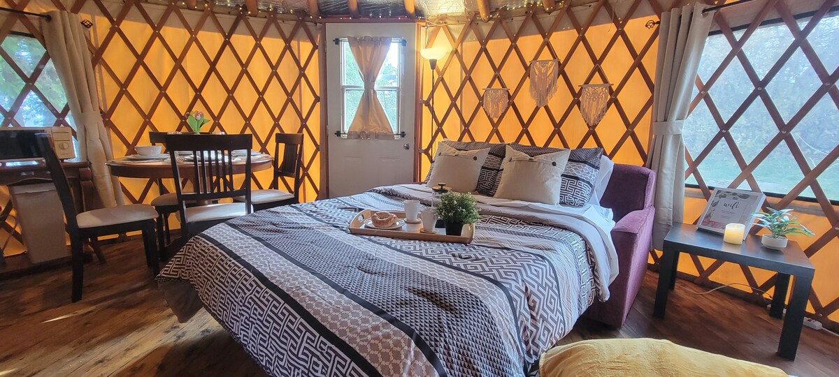 Reconnect with nature at Tall Pines Nature Retreats, where a luxurious hand-painted yurt with an indoor soaker tub offers comfort and calm in a forest sanctuary on a riverside horticultural farm. Stargaze by the fire, unwind beneath intricate ceiling art, or explore a magical riverside. Paddle, swim, or float with seasonal use of canoe, kayak, SUPs, or snowshoes. This is a registered agri-tourism farm offering a nature and wellness retreat—not a typical short-term rental.