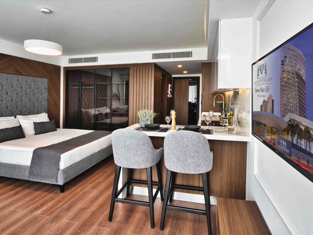 Smješten u Grand Sapphire C Bloku, ovaj studio apartman sa pogledom na more je jedna od rijetkih opcija smještaja koje nude udobnost, pogled i prestiž. Boravak ovde nije samo provođenje noći, to je početak dana uz osećaj spokojstva Mediterana i oslobađanje od umora današnjice uz pogled. Najjača karakteristika apartmana je neometan i impresivan pogled na more. Možete se probuditi gledajući kako sunce izlazi iznad mora ujutro.