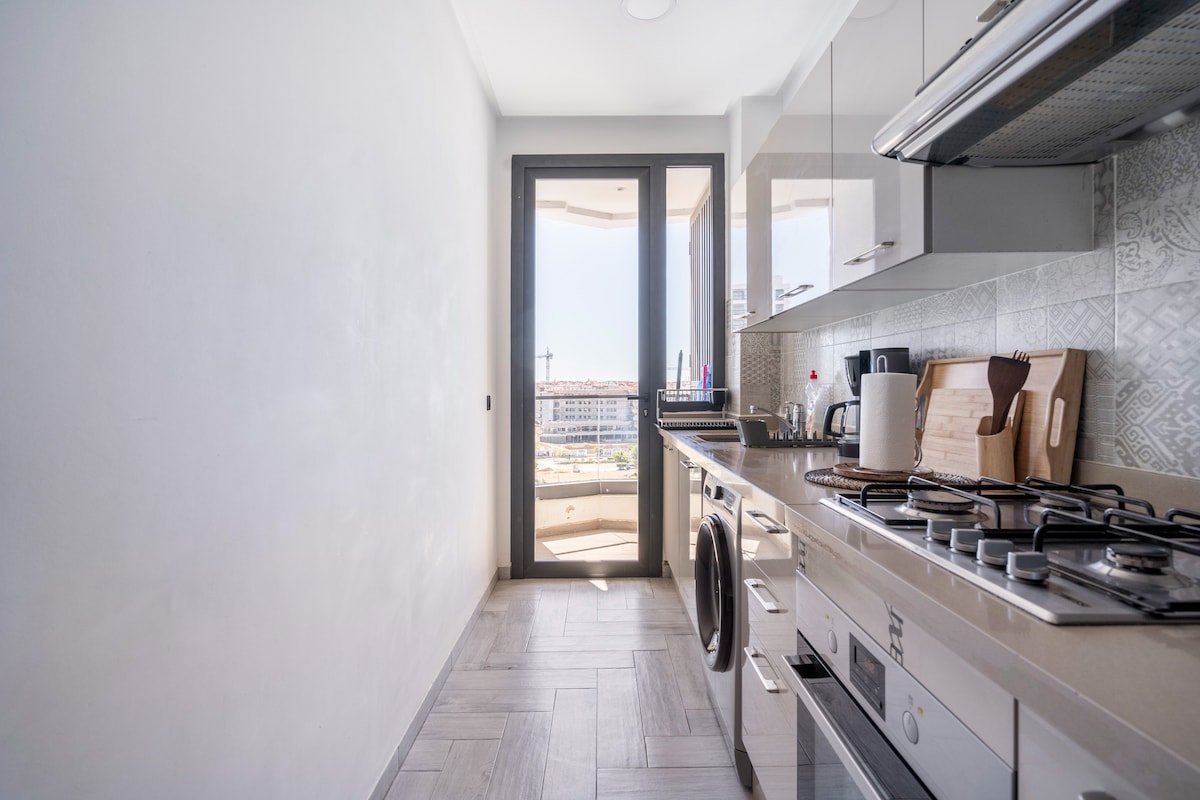 Uživajte u modernom dvosobnom apartmanu u CFC-u sa udobnom privatnom terasom sa pogledom na horizont — savršena kombinacija udobnosti, elegancije i urbanog života. Premium udobnost: Posteljina i čaršavi od 100% pamuka. Reverzibilni klima uređaj, WiFi optičko vlakno, Smart TV QLED 55" i IPTV. Prebivalište: Uključeno je 24-časovno obezbjeđenje i privatni parking. Tih prostor (bez žurki). Idealno za izuzetan boravak u novom šik području Kazablanke.