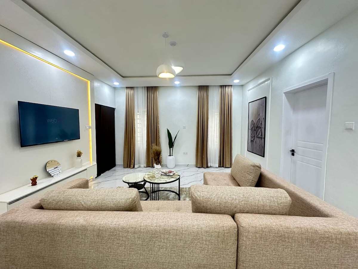 D'EXQUISITE APARTMENTS, novoizgrađeni u januaru 2024. godine sa najsavremenijim luksuznim sadržajima u mirnom, mirnom, jedinstveno okruženje prikladno za porodice u blizini atrakcija , tržnih centara, salona/barova e.t.c . Struja non-stop, besplatan internet/WI-FI, besplatan parking i prostrani kompleks koji se može koristiti za zabave/ okupljanja. Cijela grupa će se osjećati prijatno u ovom prostranom i jedinstvenom prostoru sa osobljem obezbjeđenja koje radi non-stop i pomoćnim osobljem na licu mjesta za besplatne usluge čišćenja.