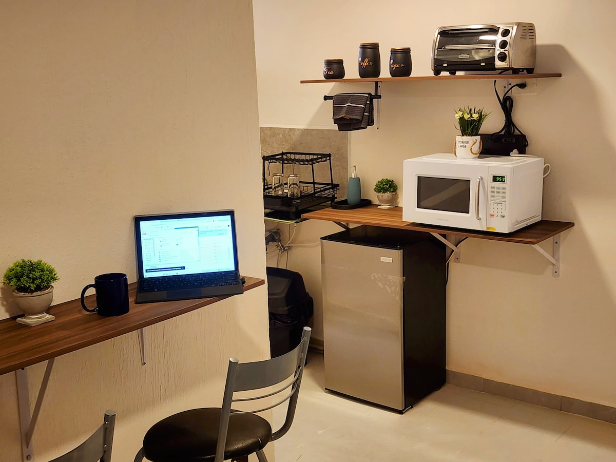 Jednostavan i nezavisan mini-apartman sa automatskim pristupom (ključ se nalazi u kutiji sa lozinkom), potpuno opremljenom kuhinjom, južnom podjelom (podjela San Hoze). Automobilom 20 min od centra grada, 15 min do Galerija, 10 do izlaza za CdMx i 5 do izlaza za Pueblu. Udaljen je 7 minuta hoda od javnog prevoza. Idealno za poslovne boravke, postoji dobro snabdevena prodavnica udaljena 30 metara, 7 minuta hoda do Oxxo i Aurrera Express, 3B, vešernice, hrana itd.