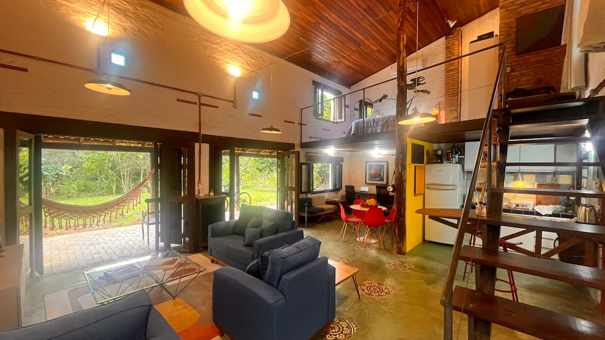 Loft com piscina viva, banheira e fogão a lenha