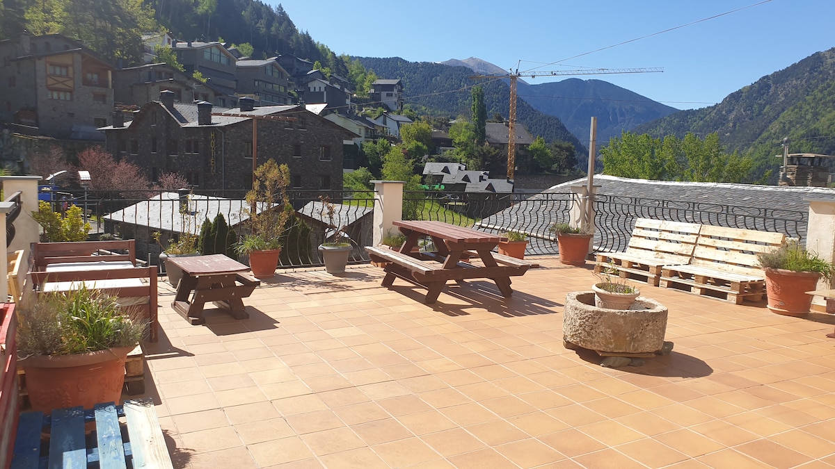 Lugares de interés: Este apartamento ( primera planta), com acceso al jardin comunitario (otro apartamento),por una escalera desde el el balcon. Dispone de 3 dormitorios, dormitorio principal suite con cama de matrimonio XXL y baño completo. Habitacion 2, con dos camas indivuales y TV. Lavabo con dutxa. Habitación 3 cama de 1,40 . Salon comedor, mesa para 6 comensales, estufa de leña y TV Cocina independiente equipada. Ubicado 20 KM de Andorra. La WIFI es de tarjeta, datos ilimitados.