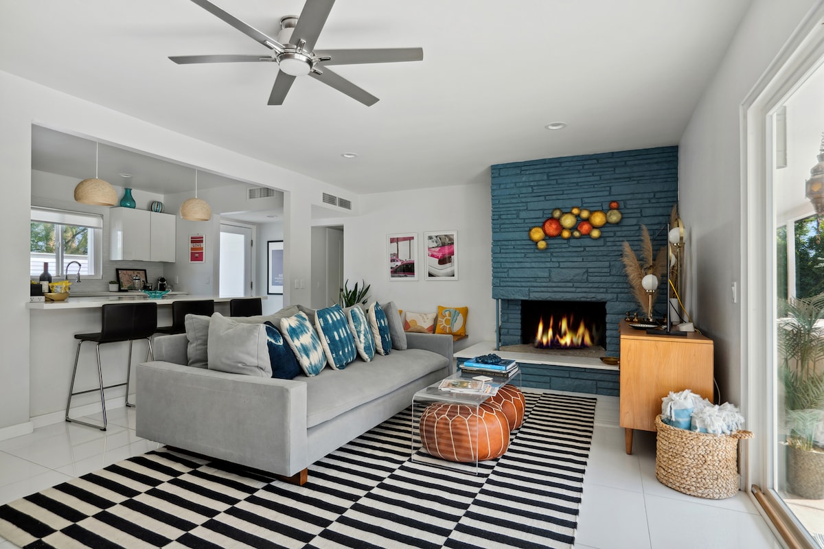 Naš smještaj u stilu sredine prošlog vijeka ukusno je modernizovan, a pritom je zadržao šarm svog doba. Ima 4 spavaće sobe / 3 kupatila (1 glavni apartman u glavnoj zgradi, 1 u zasebnoj kućici). U zadnjem dvorištu vlada atmosfera privatnog odmarališta u retro stilu, sa ručno oslikanim zidnim muralom, bazenom sa slanom vodom i spa centrom, ognjištem na plin, roštiljem, dušekima na naduvavanje za bazen, natkrivenom terasom sa dovoljno mjesta za opuštanje i više od 50 godina starim drvetom grejpfruta. Voljeli bismo da budete naši gosti i da vam pružimo vrlo jak Wi-Fi, pogled na planine i svjež pustinjski vazduh. Gradska uprava Palm Springsa, ID br. 3033