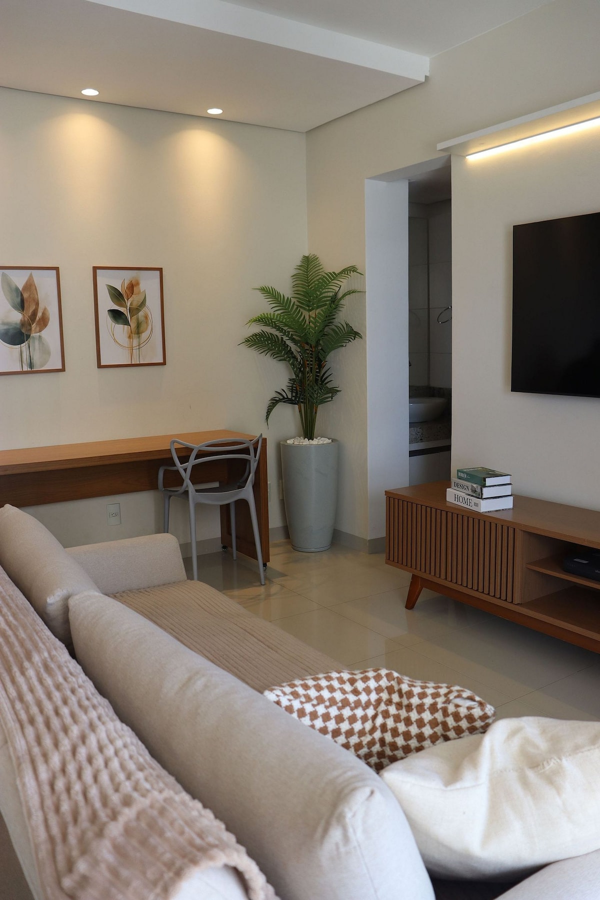 Flat espaçoso e confortável, ambiente totalmente integrado, contendo ambiente compartilhado de dormitório com rack de TV entre o quarto e sala de estar e um balcão para a cozinha no estilo americano. Ambiente perfeito para hospedagem de casais e viajantes à trabalho. O Flat acomoda até dois adultos em cama de casal Quen Size..
