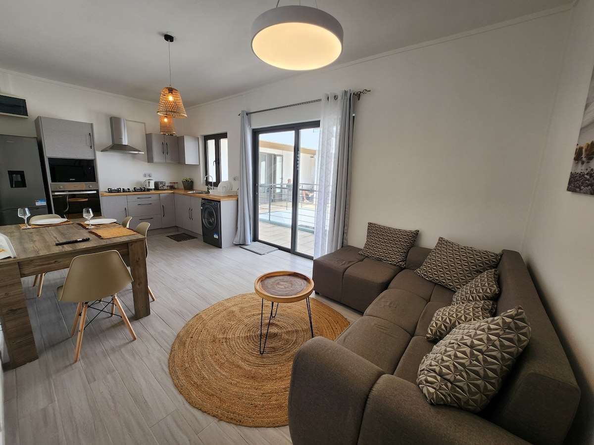 Your 1st floor apartment in a new, small guest house. You will enjoy privacy and 2 Bedrooms, 2 Bathrooms, lounge, 2 kitchens and private patio. The property has heated roof top swimming pool, gym and picnic table. Located close to private beaches and boutique hotels. Your have a large private BBQ terrace, outside seating, and access to bar and others areas. Local restaurants and hotels are a short walk. AC in all rooms. Point aux Canionniers is between Mont Choisy Beach and Grand Baie.