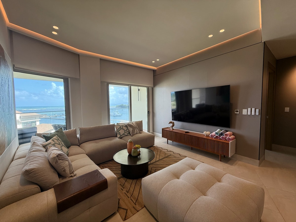 escondidapanama • Modern 3BR/3BA condo 305A Marina Village, ocean + marina views and a dine-out patio • Fully equipped kitchen and elegant living room with large smart TV and ambient LED lighting • BR1: King bed, 55" TV, en-suite bath, custom headboard and warm wood finishes • BR2: Queen bed, smart TV, mandala feature wall, soft neutral palette • BR3: Kids’ room with 4 twin bunks, work desk, TV, green view • Luxurious Contemporary design, built-ins, blackout shades, bamboo cotton delux sheets