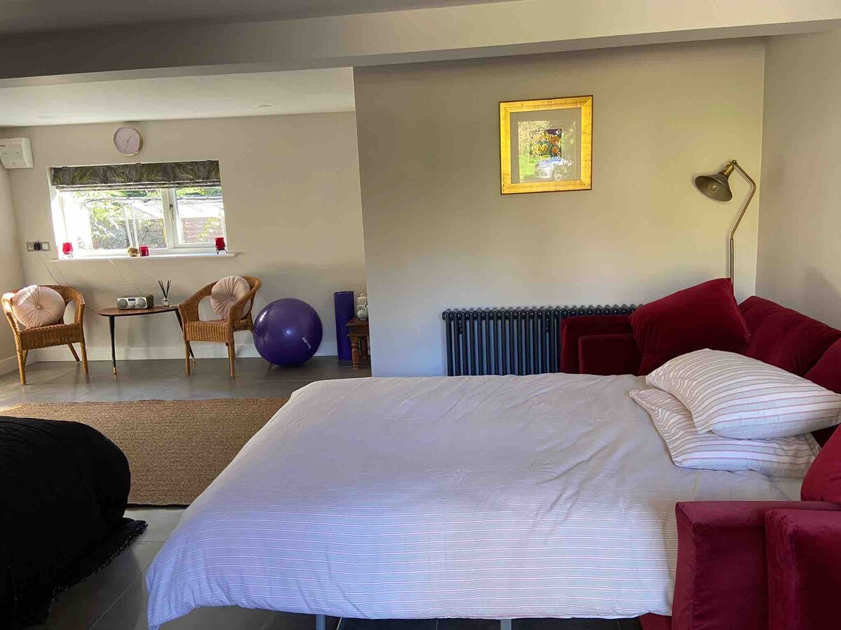 Samostalna, velika, svetla i prozračna garsonjera u mirnom stambenom prostoru sa sopstvenim ulazom, kuhinjom i kupatilom. Parking. 5-8 minuta hoda do autobuske stanice koja je na direktnoj ruti do željezničke stanice i centra grada. Lokalne prodavnice i pab 15 min. hoda. Centar grada Henli udaljen je 6,5 milja, a autobusom (autobuska stanica je udaljena 5 minuta hoda od studija) traje 20-25 minuta.