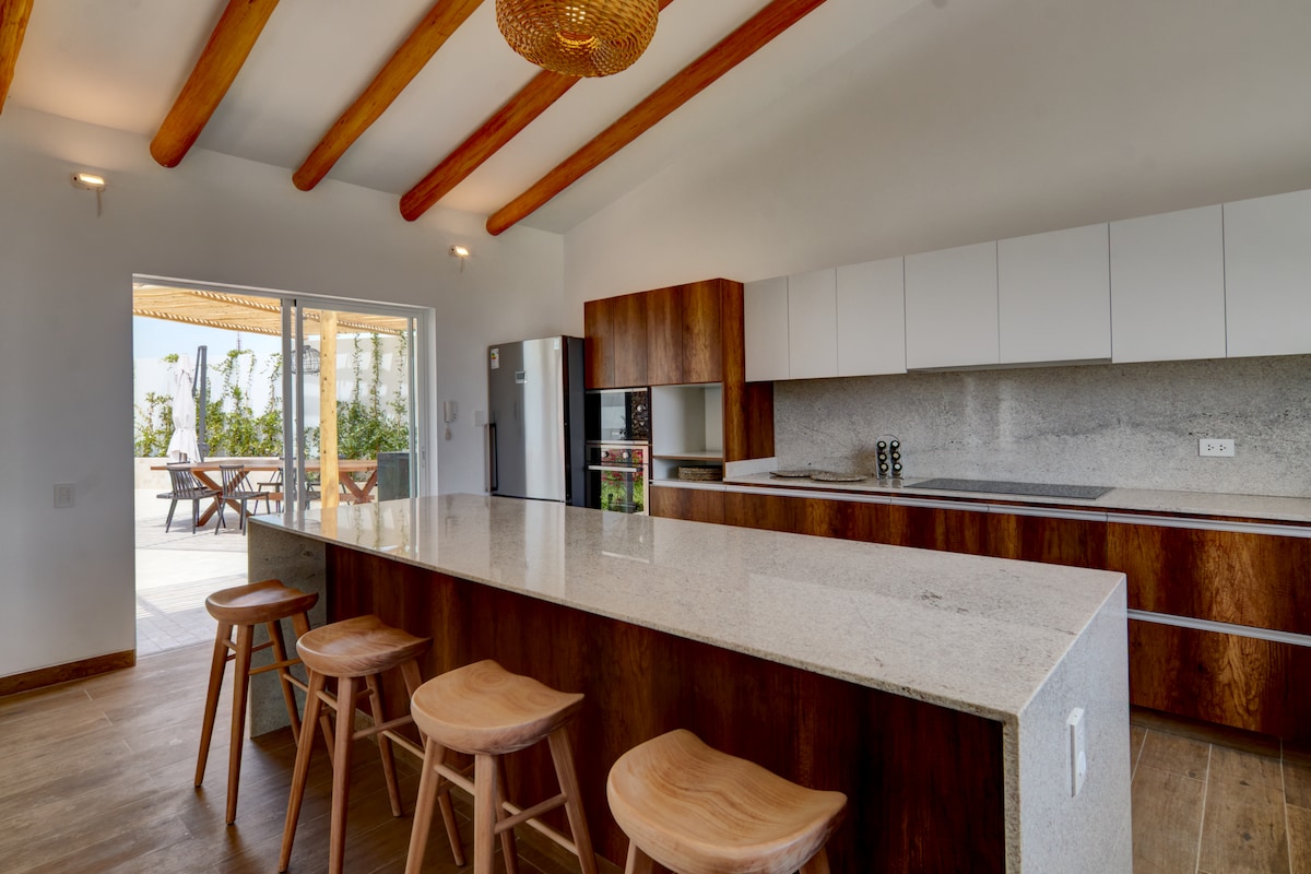 Moderna i svijetla, luksuzna kuća, sa bazenom uz plažu, samo nekoliko koraka od okeana. Domaćica i privatni kuvar su uključeni! Nalazi se u jednom od najlepših prirodnih rezervata u Južnoj Americi (Paracas) - oazi na plaži usred pustinje, okružen je nacionalnim parkovima i vekovima istorije pre-inka, a udaljen je 1 sat od linija Nazca! 3 prostrane spavaće sobe sa kupatilom i ormarom, TV sobom, modernom kuhinjom, vešernicom i spavaćom sobom za uslužno osoblje, pravim draguljem!