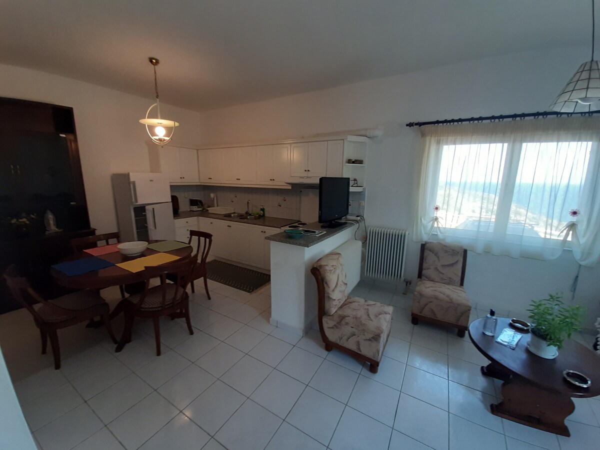 Kameni apartman na samo 10 metara od plaže. Veoma veliki prozori za uživanje u pogledu na more, spoljna pergola sa prostorom za sedenje i stolom. Potpuno opremljena kuhinja i udobno kupatilo/tuš kabina. Penjući se drvenim stepenicama dolazite do spavaće sobe iz koje možete bolje uživati u pogledu na more. Intenzivno prisustvo drveta u kombinaciji sa ugrađenim krevetom i kaučem podseća na velelepne kuće na Kikladi.