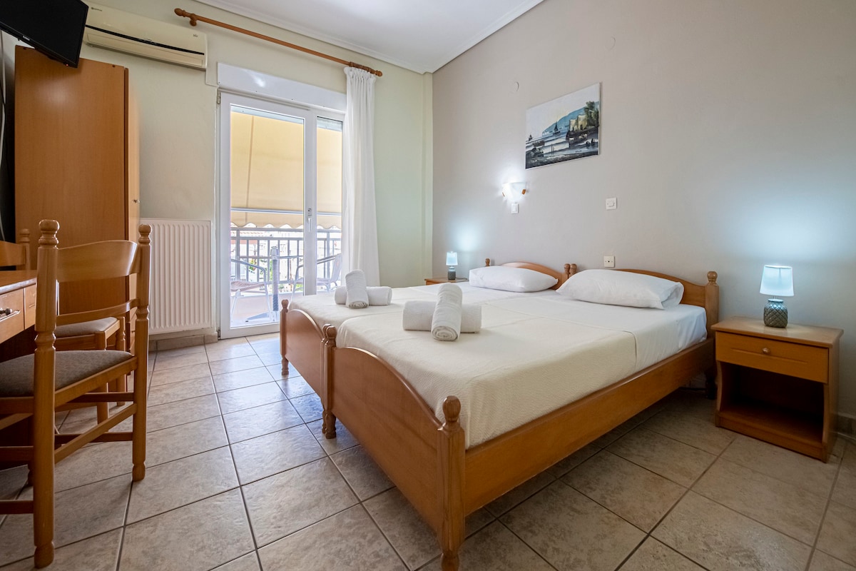 Prostrani bračni krevet u udobnoj jednokrevetnoj sobi od ukupno 14 m2, sa privatnim kupatilom i balkonom koji gleda na najljepši park u Paralia Kateriniju.