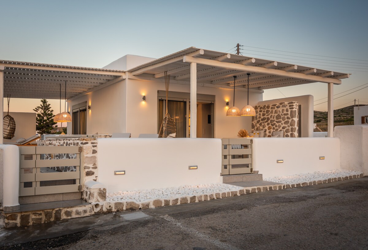 Kuća na plaži otvorenog prostora, 60 m.n.m. za 6 osoba sa 1 bračnim krevetom, 2 kauča na razvlačenje i 2. soba sa 2 kreveta za jednu osobu veoma elegantna i udobna. Ukrašen je bohom i udobnim dizajnerskim stilom u kombinaciji sa kikladskom kulturom. Kuća ima direktan pristup verandi sa pogledom na more, sa velikim trpezarijskim stolom. Nalazi se u malom zalivu, sa sličnim mjesečevim bijelim stijenama kao Sarakiniko koje čine osamljenu uvalu ispred kuće, zajedno sa Akva kućom 1 i 3. U ponudi je korpa dobrodošlice sa lokalnim proizvodima.