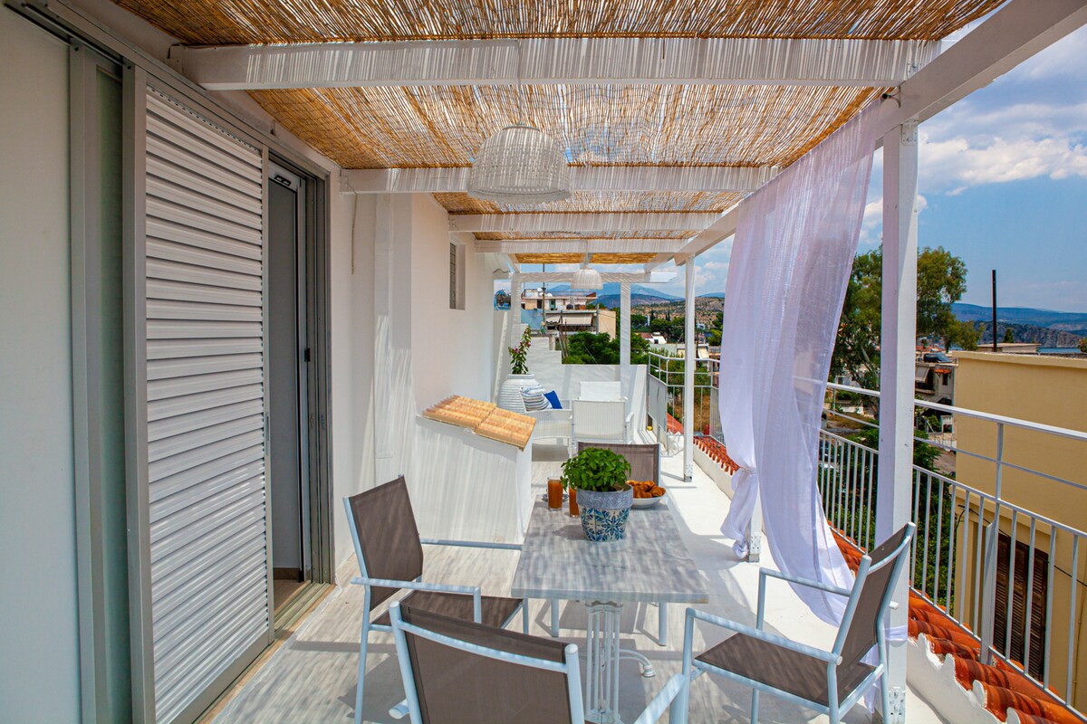 A 50m² penthouse apartment (bedroom, living room, bathroom & kitchenette) roof-garden of 150m²- wonderful view of Palamidi castle & central park. Between new & old part of town. Easy parking. Lift. Sights, shops, bars, restaurants, banks & beach of Arvanitia, within walking distance.