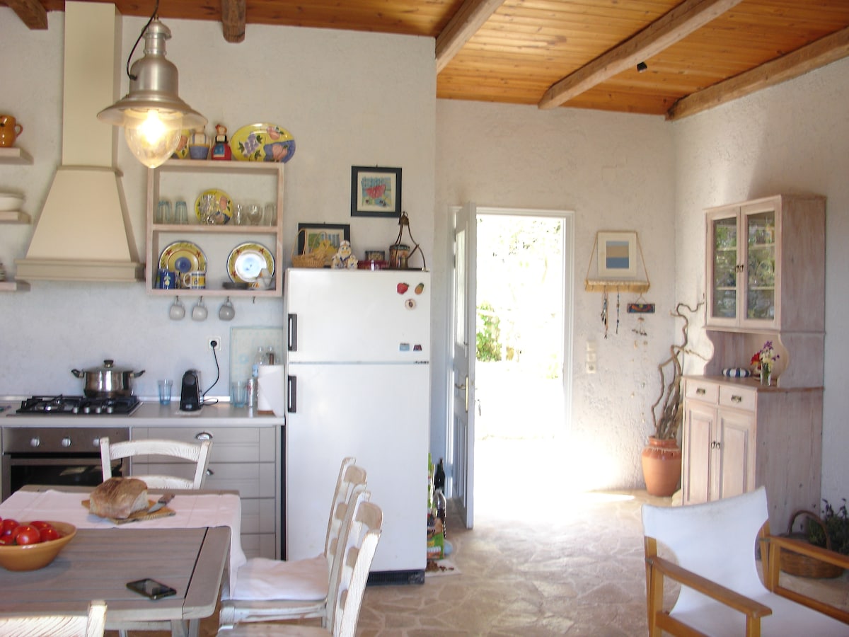Tradicionalna grčka kamena seoska kuća, koja se nalazi u maslinicima, manje od 10 minuta hoda do sela Loggos i kraća šetnja do plaža Marmari i Kipos. Tu je jedna glavna dvokrevetna soba i jedna manja spavaća soba sa krevetima na sprat.