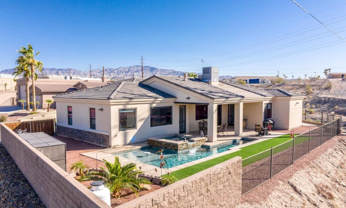 ⭐️ 3000 kvadratnih stopa s luksuznim dizajnom i dekorom ⭐️ Mins to Riviera Marina and Downtown ⭐️ Bračni kreveti (širine 180-179 cm) ⭐️ Viseća ležaljka, igre i zelenilo ⭐️ Golf teren i Mauntin Vju ⭐️ Nalazi se na drugom zelenom Naša potpuno renovirana kuća za odmor na otvorenom u zatvorenom prostoru pravi je doživljaj u Lejk Havasu Sitiju Skoro 3000 kvadratnih stopa i dovoljno prostora za 14 gostiju, The Clubhouse izgleda kao odmaralište s 5 zvjezdica i osjeća se kao dom izrađen s ljubavlju. Sadržaji uključuju bazen, hidromasažnu kadu, viseću ležaljku, zelenilo i ognjište.