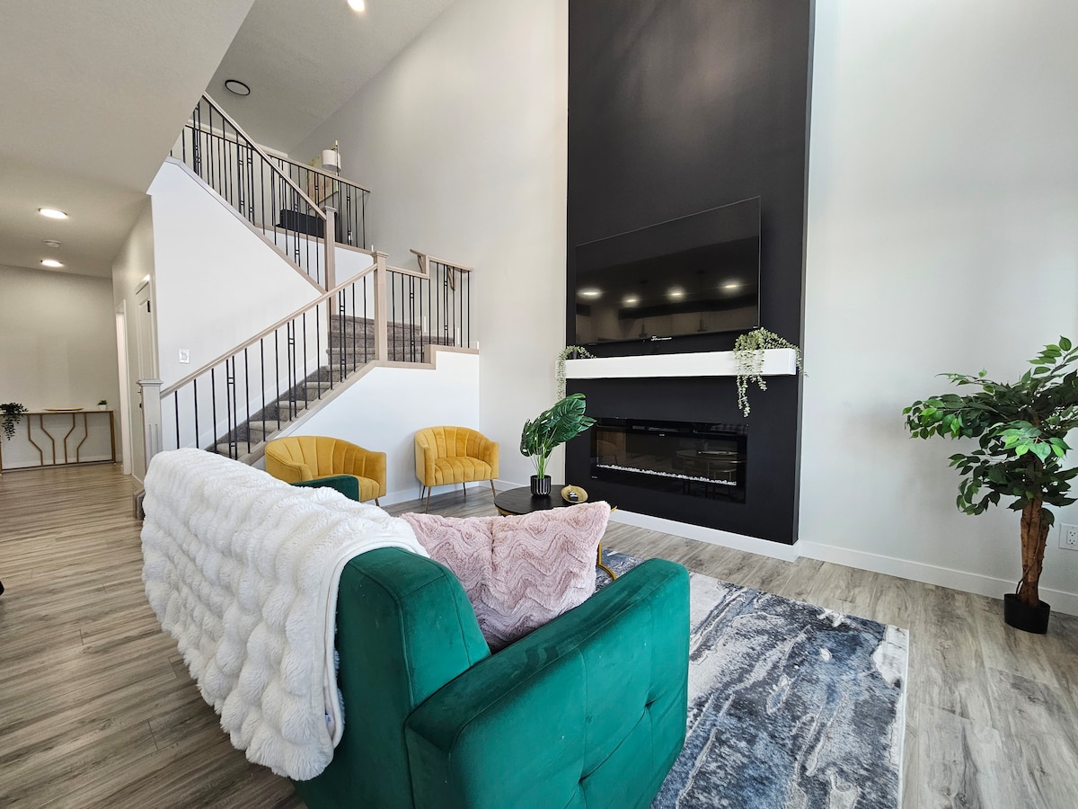 Dobro došli u naše luksuzno utočište sa 5 kreveta i 3,5 kupatila u luksuznom komšiluku! Uživajte u bioskopu, sto za bilijar sa kabrioletom i spokojnoj hidromasažnoj kadi. Glavna spavaća soba ima TV od 75inča, RGB osvetljenje i spa apartman. Zakoračite na unutrašnje dvorište sa vatrogasnim stolom, hidromasažnom kadom i dovoljno mesta za sedenje. Živahno RGB osvetljenje u dvorištu stvara raspoloženje. Do terena za golf ima samo 5 minuta vožnje peške do tržnog centra Vest Edmonton. Doživite luksuz i praktičnost na ovom ekskluzivnom mjestu!