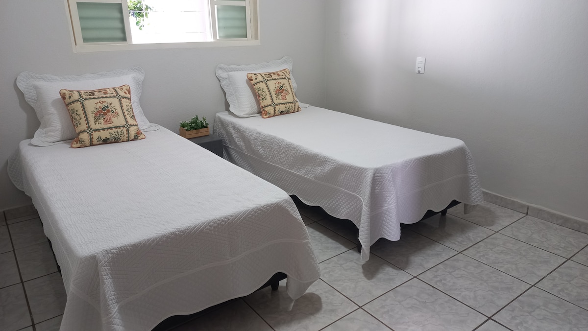 Velika i udobna kuća, 1 min od ABCZ, 4 min od BR-050 i 5 min od tržnog centra Uberaba. Idealno za putovanja, posao, zaustavljanja i događaje. Obezbjeđujemo peškire, posteljinu i osnovne potrepštine. Odlična lokacija, udobnost i praktičnost! Može da primi do 9 osoba: glavni apartman sa klima-uređajem (2 bračna kreveta), spavaća soba sa bračnim krevetom i krevetom za jednu osobu sa krevetom na razvlačenje, plus kauč na razvlačenje u dnevnoj sobi. Opremljena kuhinja, Wi-Fi, spoljni prostor i 2 parking mesta. Udobnost i praktičnost na jednom mjestu!