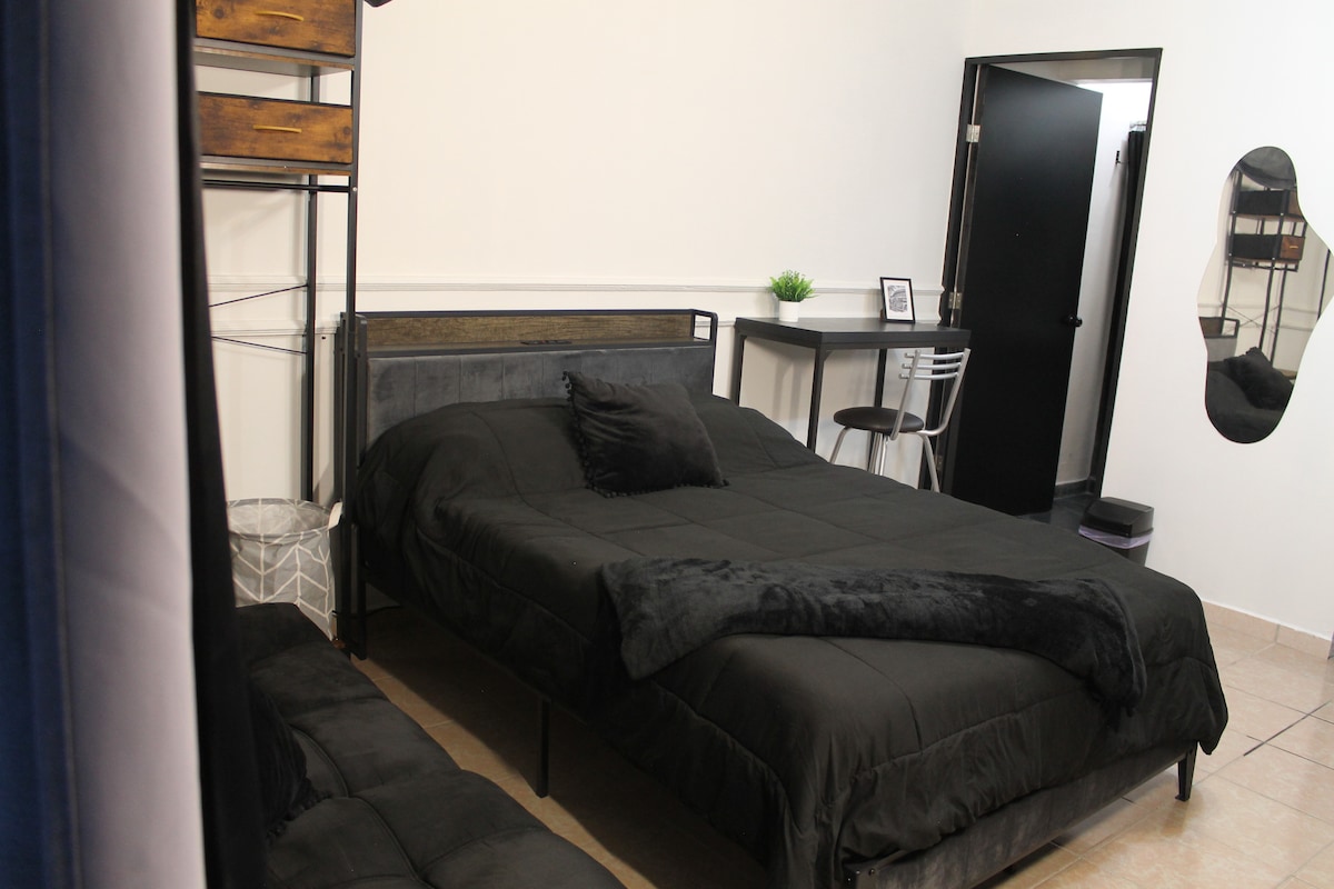 Odlična lokacija. Kablovska TV, bračni krevet, đakuzi, balkon, kuhinja opremljena magnetnim indukcionim šporetom, mikrotalasnom rernom, aparatom za kafu i priborom za kuvanje. Nekoliko blokova od stadiona Viktorija i Deportivo IV Centenario. U blizini železničkog kompleksa u kojem se nalaze Muzej savremene umetnosti, Bolnica Hidalgo, Grupo Moda, Teleton i Tres Centurias. Pristup jugu/severu grada za 15 minuta. Na deset minuta od Poliforum Charro. Uživajte u onome što Ags ima za vas. Odmorite se i osećajte se kao kod kuće.
