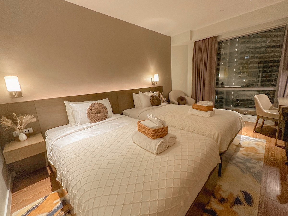 Modern twin suite near Makati & Rockwell with city views, fast WiFi, and pool access. Ideal for staycation, business, and remote work. Stay at a modern twin hotel suite near Makati, Rockwell, and Ortigas. Located at Novotel Suites Manila at Acqua, this high-floor unit offers city and river views, fast WiFi, and easy access to top business districts, malls, and restaurants. Perfect for staycations, business trips, and remote work.