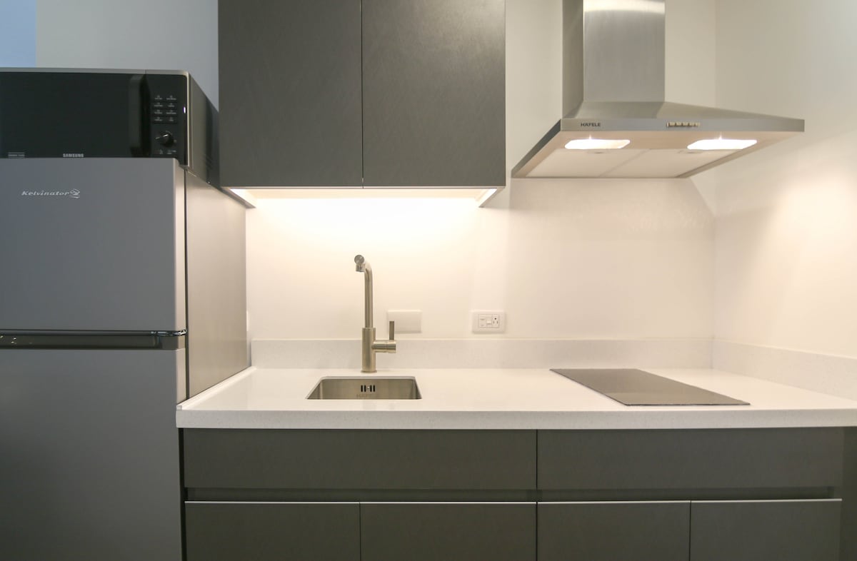 Ovaj studio na uglu koji se uzdiže 45 spratova iznad Makatija pruža spektakularan pogled na horizont grada. Unutrašnjost je moderno inspirisana enterijerom sa pažljivo osmišljenim detaljima. Poseban radni sto za rad na daljinu i trpezarija pored prozora za uživanje u jelima s pogledom. U zgradi možete uživati u sadržajima nalik hotelskim, uključujući bazen sa đakuzijem, teretanu i mini-biblioteku, a tržni centar Century City je odmah preko puta!