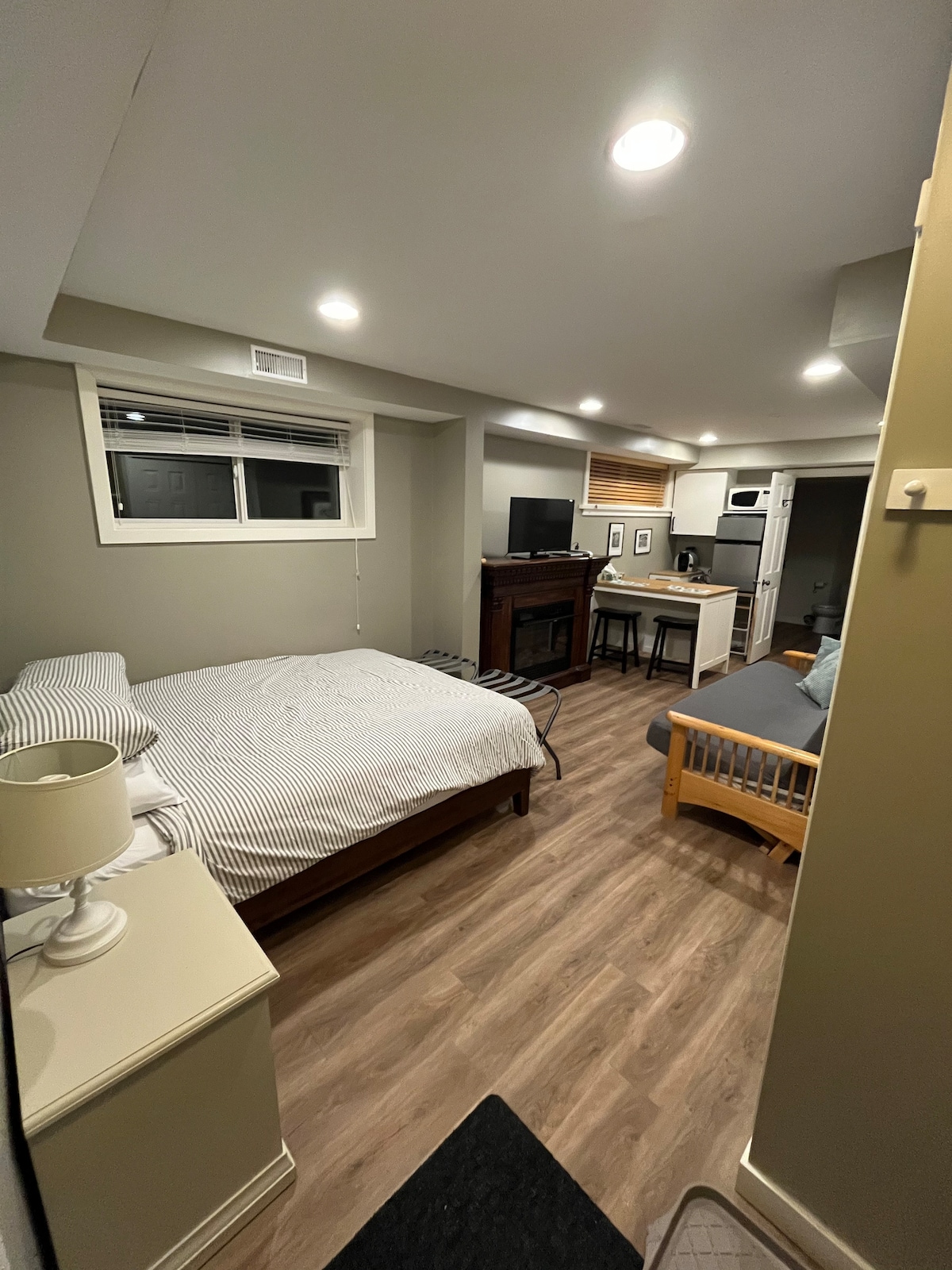 Moderan jednosoban prizemni podrumski apartman sa prostranim dnevnim boravkom u novom dijelu u blizini univerziteta. Udobno za 2 odrasla gosta. Nalazi se u blizini autobuske stanice i na nekoliko minuta vožnje do prodavnica Walmart, Costco i Superstore. Privatan ulaz sa praonicom veša u apartmanu. Kuhinja je opremljena priborom od nerđajućeg čelika i pločom za kuvanje. Tu su Telus Optik TV i Netflix za uživanje na pametnom televizoru sa ravnim ekranom od 55 inča. Dostupan je besplatan parking na ulici za jedno vozilo.